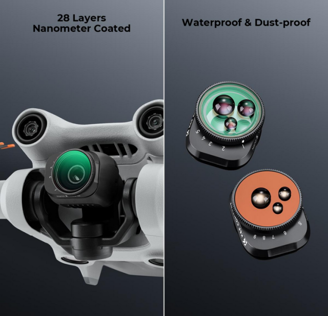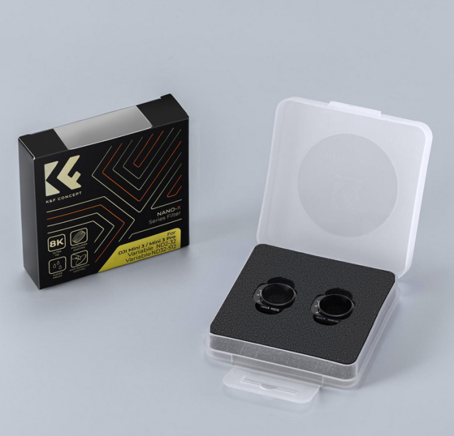 The K&F Variable ND Filter Set for DJI Mini 3 Pro and Mini 3 includes adjustable ND2-ND32 and ND32-ND512 filters, allowing for precise exposure control without color shift. Made from high-quality AGC optical glass with 28 layers of nano coating, these filters offer reduced reflections, waterproofing, scratch resistance, and protection against mold and oil. Designed to be ultra-lightweight, they do not affect the drone gimbal's performance and feature a quick-release design for easy and secure installation.