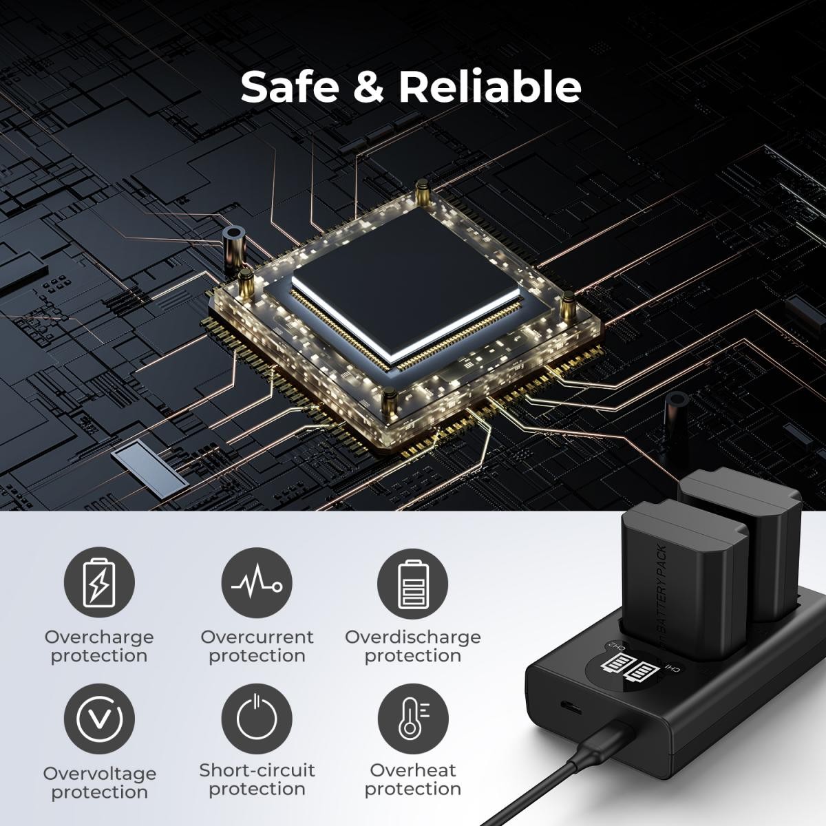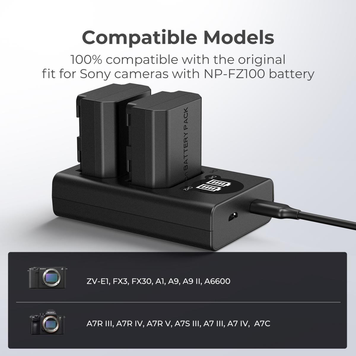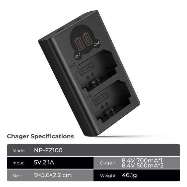 Charge your Sony NP-FZ100 batteries efficiently with the K&F FZ100 Dual Channel Charger. Featuring dual charging ports and versatile USB-C/Micro USB input, this charger can power two batteries simultaneously while intelligently protecting against overcharging, overcurrent, and overheating.