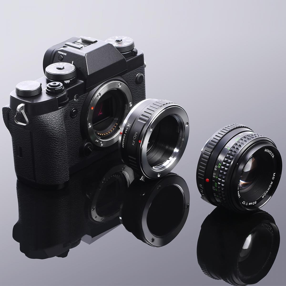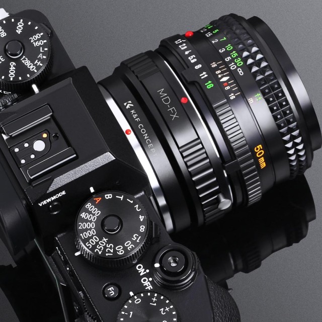 The K&F High Precision MD-FX Lens Adapter allows Minolta MD/MC mount lenses to be used on Fujifilm X-series mirrorless cameras, featuring durable all-metal construction and full infinity focus compatibility.