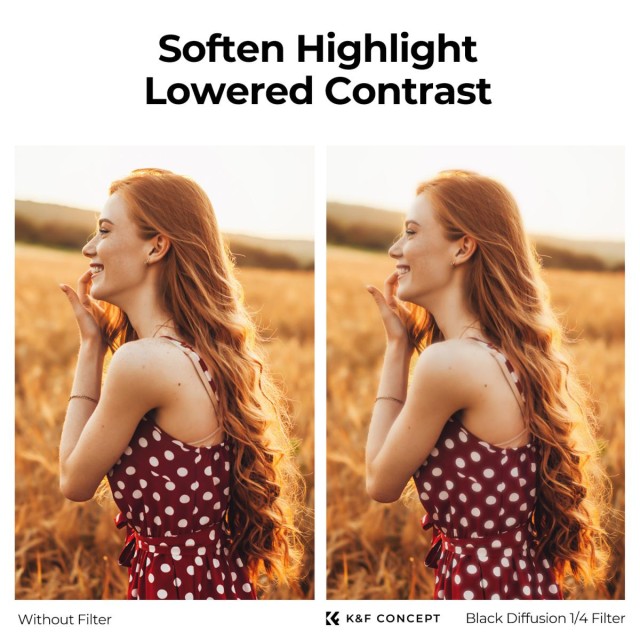 The K&F SNJ51T 100×100×2mm Square Black Mist 1/4 Filter Kit is designed to create a soft, cinematic effect in both photography and video production. This black diffusion filter subtly softens facial features such as wrinkles, freckles, and pores, giving skin a delicate, glowing appearance. Its hazy film effect adds a dreamy, ethereal quality to your images, making it ideal for portraits and cinematic video.