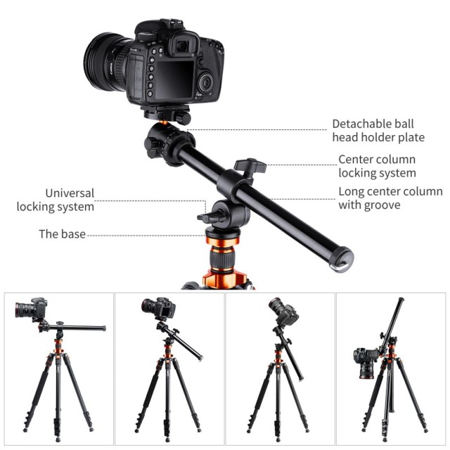 28mm Large 360° Metal Ball-Head Upgrade: K234A7, With two independent control knobs, the specially designed 28mm metal ball-head can rotate 360 degree allowing you to take photos at any angle with horizontally and vertically. Multi-angle Shooting: Center Column could turn to invert situation for low angle shooting;The damping system of the ball head would set your camera at different angles easily(vertical shots or up-side shots) or and get the best shooting view.