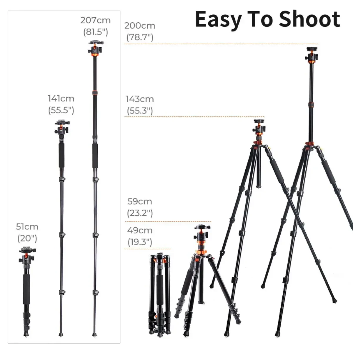 - * 【Convenient: From 59cm to 200cm Flexible Adjustment】4-section column legs with 3 quick release flip-locks allows you to adjust the working height from 59cm to 200cm in seconds.Winner in height! 45cm folded size is easily took to anywhere for outdoor photography