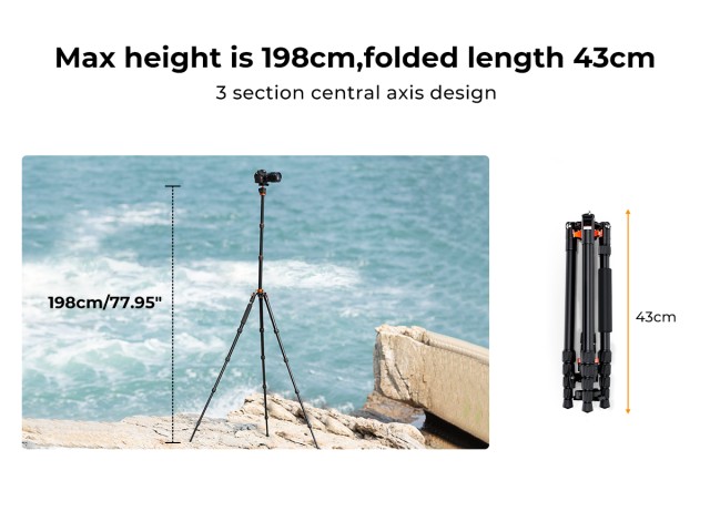 Innovative 3-section central axis design, allows the tripod to obtain increased shooting height of 198cm while maintaining compact folded length of 43cm. The tripod combines practical featuers and portability, with a maximum height (without centre column) at 135cm, providing effortless stability and optimized shooting height perfect for either indoor or outdoor use. Max height is 198cm, making shooting while standing easier than ever before. Min height is 56cm making this device adaptable to almost all conditions and environments.