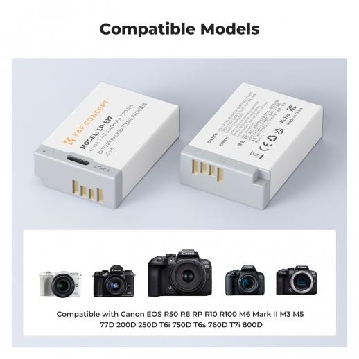 1040mAh Powerful Battery Capacity. K&F Concept 2-Pack LP-E17 batteries provide long-lasting power for extended camera shooting. Fully Decoded Replacement Battery. This LP-E17 battery is widely compatible with Canon EOS R10, EOS M6 Mark II, Rebel SL2, T6i, T6s, T7i, EOS 200D 750D 760D 77D, 800D 8000D KISS X8i Digita SLR cameras. It is fully decoded and no pop-up warning on your camera.