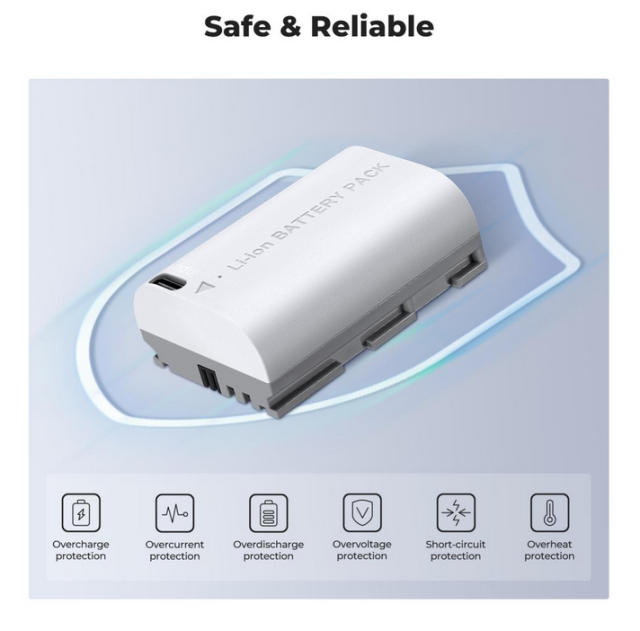 The K&F LP-E6NH 2600mAh Battery Pack with Type-C Fast Charging for Canon cameras is designed to keep your photography sessions uninterrupted. With a powerful 2600mAh capacity, these batteries ensure you can capture beautiful sceneries without worry. The convenience of Type-C fast charging allows you to connect the battery directly to a power adapter using the included cable, fully charging in about 2 hours without needing an extra charger. These fully decoded replacement batteries are compatible with a wide range of Canon cameras, including EOS 90D, 80D, 70D, 5D Mark II, III, IV, 5DS, SR, 6D, 6D Mark II, R5, R6, R6 II, and R7, with no pop-up warnings. Multiple charging options include USB wall chargers, car chargers, and power banks, offering flexibility and reliability with six types of protection: temperature, over-voltage, over-discharge, over-current, over-charge, and short-circuit. The premium design features a charging indicator that shows red when charging and green when fully charged.