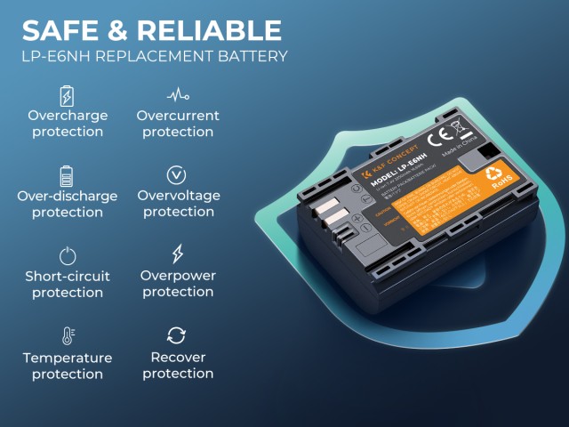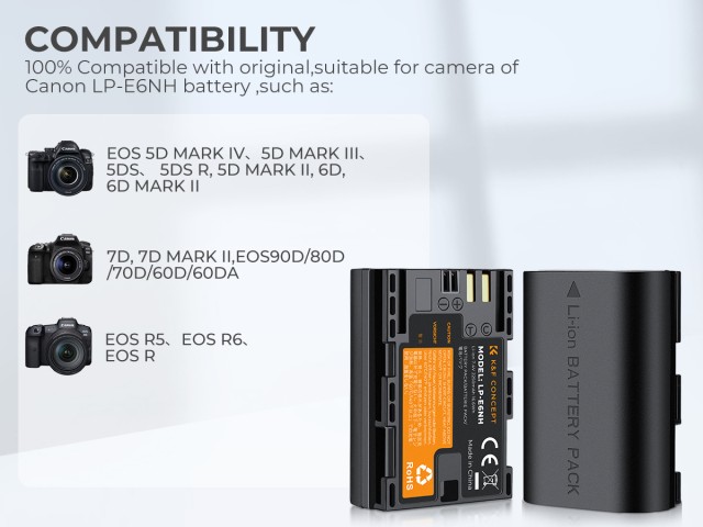 K&F CONCEPT's LP-E6NH battery is compatible with Canon cameras that use LP-E6NH/LP-E6N/LP-E6 batteries, such as Canon EOS R5, EOS R6, EOS R, EOS 5D Mark IV, 5D Mark III, 5DS, 5DS R, 5D Mark II, 6D, 6D Mark II, 7D, 7D Mark II,90D, 80D, 70D, 60D, 60Da (Note: The above are only some of the models listed)