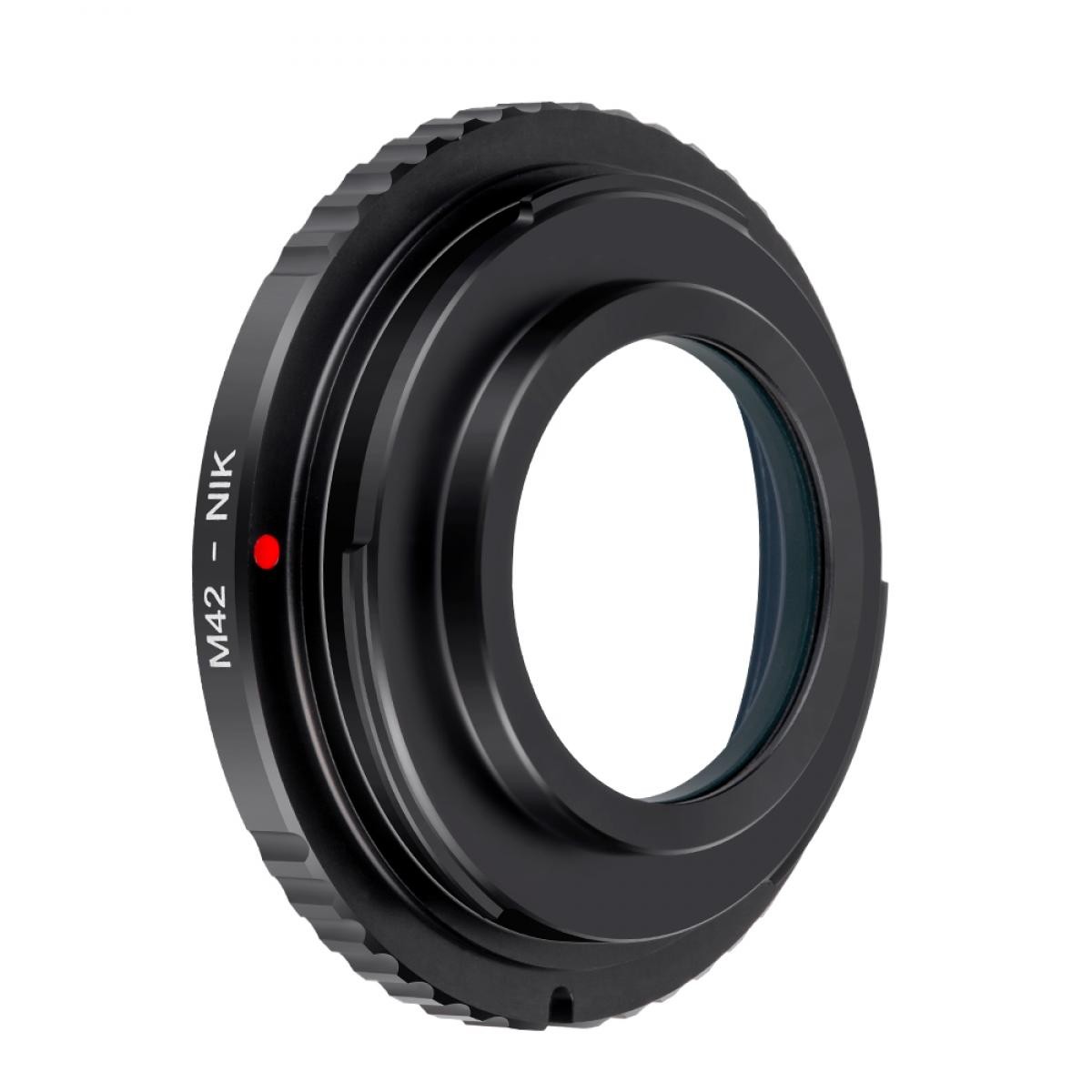 The K&F M42 to Nikon Lens Adapter with Optic Glass allows M42 mount lenses to be used on Nikon DSLR cameras, featuring durable brass-and-aluminum construction, precision manual operation, and integrated optical glass for infinity focus.