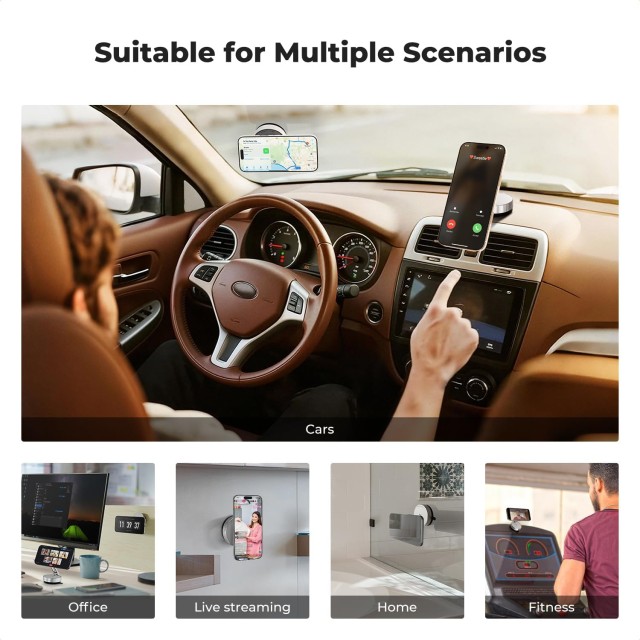 With 360° rotation across three axes — base, connecting rod, and magnetic frame — this mount allows precise angle adjustments, and reinforced alloy construction ensures stability during use. Its wide adhesion surface works on a variety of smooth surfaces, including dashboards, glass, walls, desktops, and even fitness equipment. Installation is simple: press the suction cup flat against a surface and rotate the locking mechanism clockwise, then allow 12 hours for maximum suction strength.