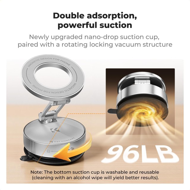 The K&F CONCEPT Magnetic Phone Holder for Car (Silver) is a versatile, 360° rotatable vacuum-suction mount with strong dual-ring N52 magnets. Compact, foldable, and compatible with MagSafe iPhones or any phone using the included metal rings, it ensures a secure hold on smooth surfaces and dashboards while offering precise multi-axis adjustment