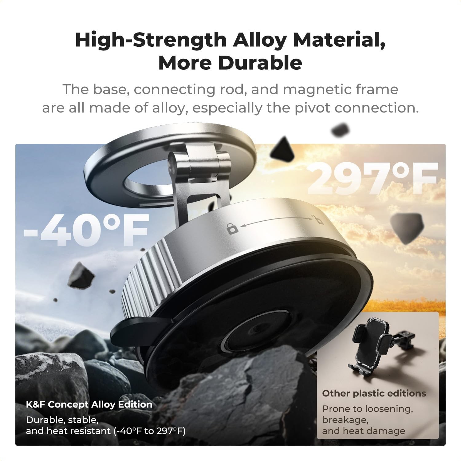 The K&F CONCEPT Magnetic Phone Holder for Car (Silver) combines strong magnetism, reliable suction, and tri-axis adjustability to create a safe and versatile phone mount for driving, working, or home use. Its dual-ring magnetic design, with 20 high-strength N52 magnets, provides a secure grip on phones even during bumpy rides. The suction cup base features a nano-gel design, enabling repeated attachment and cleaning without losing adhesion, and performs in extreme temperatures from -104°F to 298°F (-40°C to 148°C).