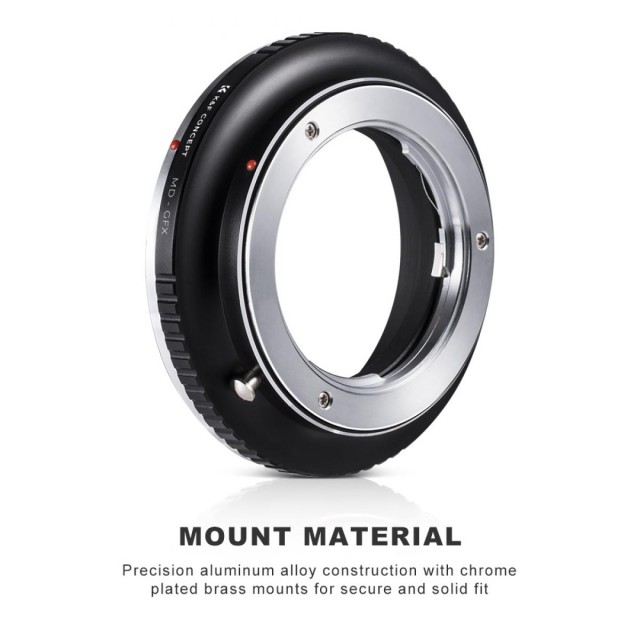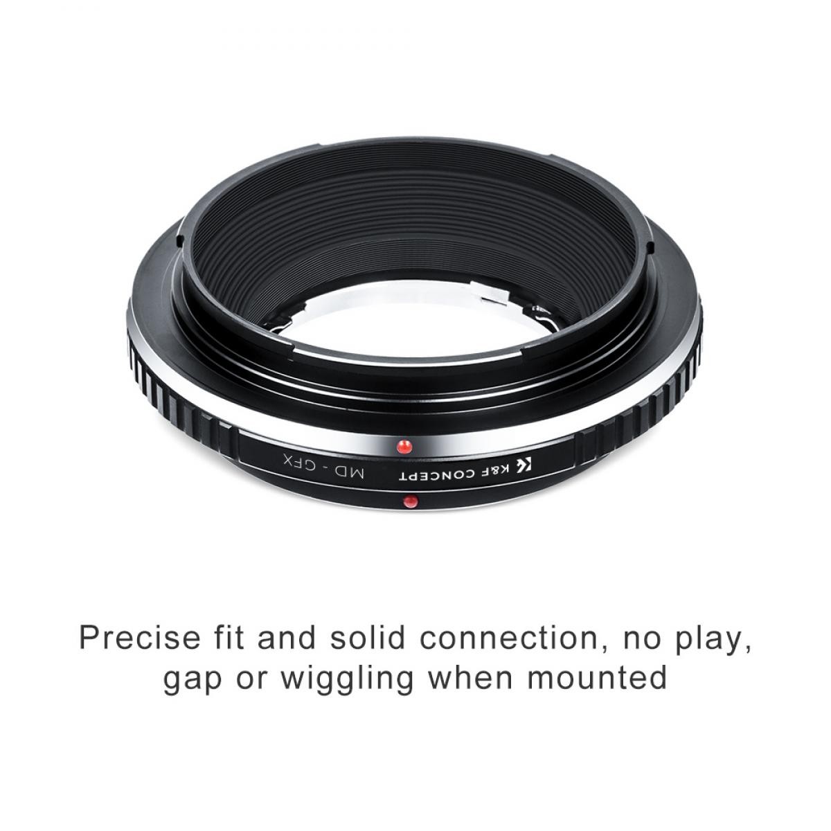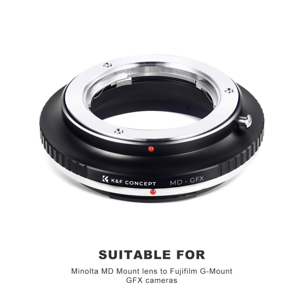 The K&F Minolta MD to Fuji GFX Lens Adapter allows Minolta MD lenses to be mounted onto Fuji GFX medium-format cameras with a secure fit, durable metal construction, and full manual control.