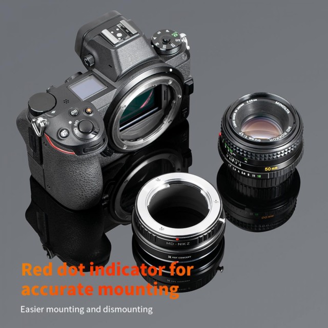 The K&F Concept Minolta MD/MC to Nikon Z Lens Adapter allows classic Minolta MD and MC lenses to be used on Nikon Z-mount cameras such as the Z6 and Z7. Built from smooth, durable copper, it supports full manual focus, infinity focus, and features red-dot alignment for easy installatio