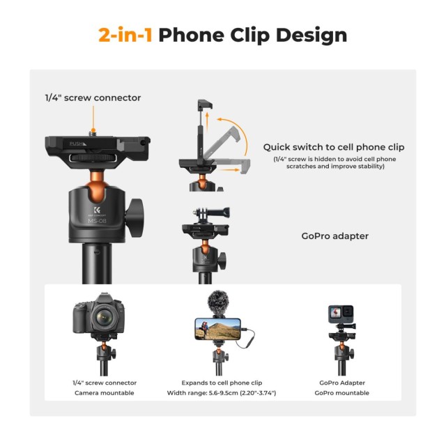 MS04 62''/1.58m Tripod Phone Selfie Stick, Black And Orange With Bluetooth Remote Control + Gopro Adapter. The maximum height reaches 157.8cm, and it supports 7-section leg adjustment. You can adjust the required height at will. This tripod head supports a load-bearing capacity of 3kg and is suitable for the needs of most mirrorless cameras, mobile phones…