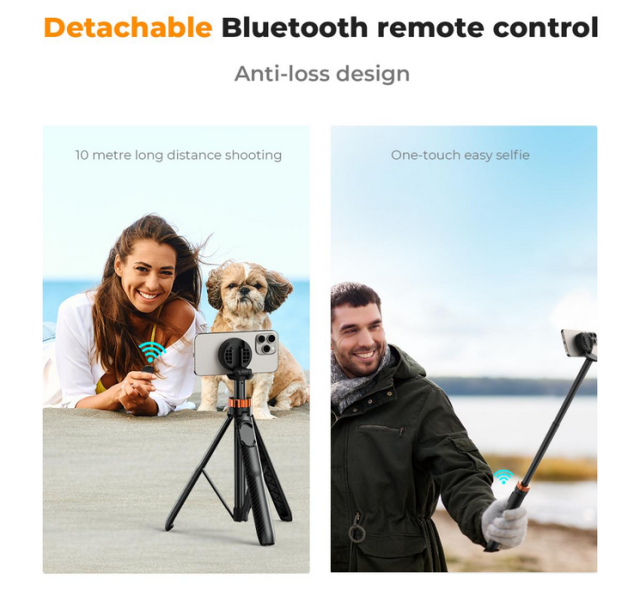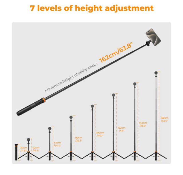 The K&F MS19 Phone Tripod offers exceptional height versatility with a maximum extension of 162cm and 7-section leg adjustment, allowing you to set the ideal height for any shot. Designed for convenience, it features a magnetic installation design, making the connection between the selfie stick tripod and your mobile phone quick and effortless. This tripod is compatible with a wide range of devices, including iPhone models from the 12 mini to the latest 15 Pro Max. The magnetic bracket ensures comprehensive shooting coverage, making it perfect for capturing scenery, portraits, or sports scenes. Integrated with a Bluetooth remote control, the tripod facilitates hassle-free selfie and travel photography, boasting a one-button operation and a secure anti-lost design with up to 10 hours of continuous work. The tripod's widened fixed structure and non-slip silicone pads at the bottom enhance stability, while the built-in shock-absorbing rubber rings in the foot tube ensure added durability and stability.