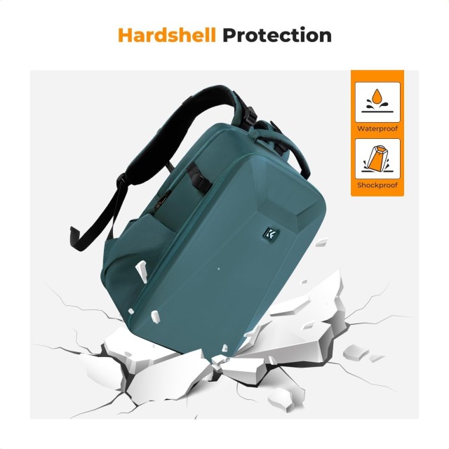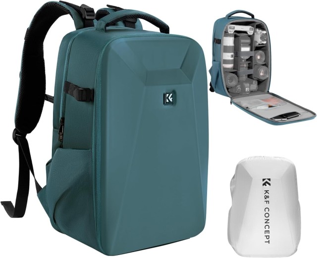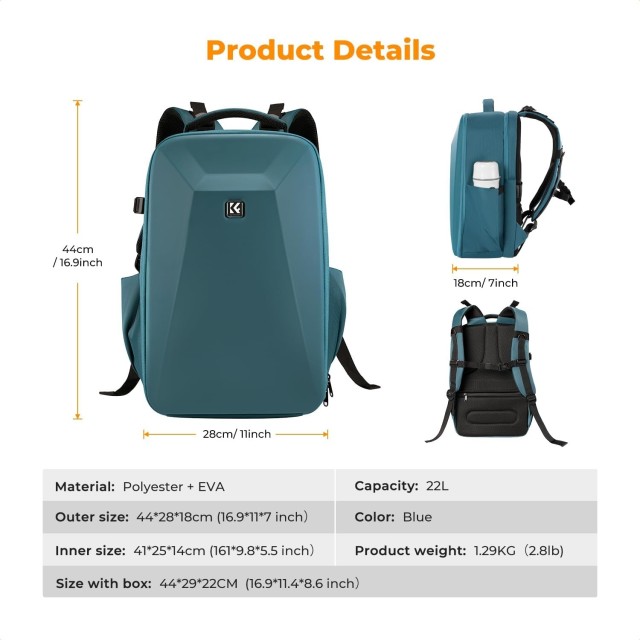 K&F Concept Camera Backpack,Hardshell DSLR Photography Camera Bag with 15-15.6 Inch Laptop Compartment Waterproof Camera Case Compatible for Canon/Nikon/Sony/DJI Mavic Drone (Blue). 2 compartments included. The front compartment is a detachable module plugin customized for different cameras, flashes, lenses, and drones, with 2+6 partitions. The rear compartment can accommodate 16 inch laptops.