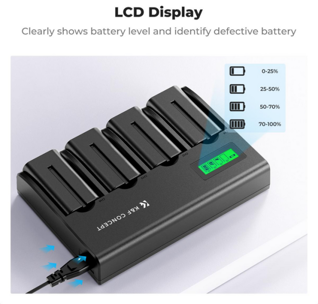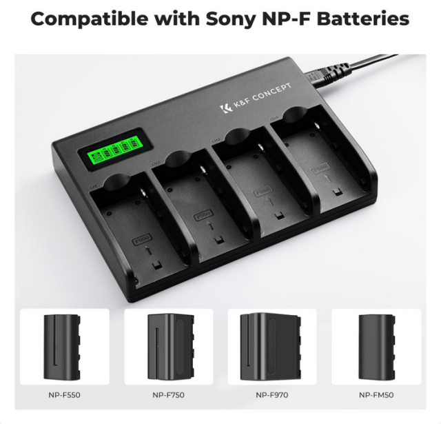 The K&F NP-F 4-Channel Charger offers intelligent fast charging for Sony DV camera batteries with an LCD display for real-time battery status.