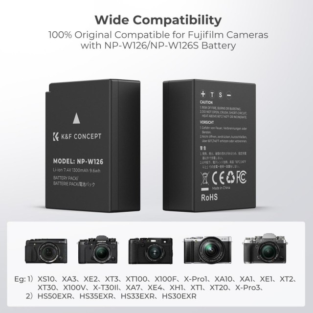 Two 1300mAh NP-W126 replacement batteries and a dual-slot charger provide more power for camera shooting
