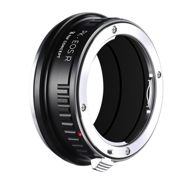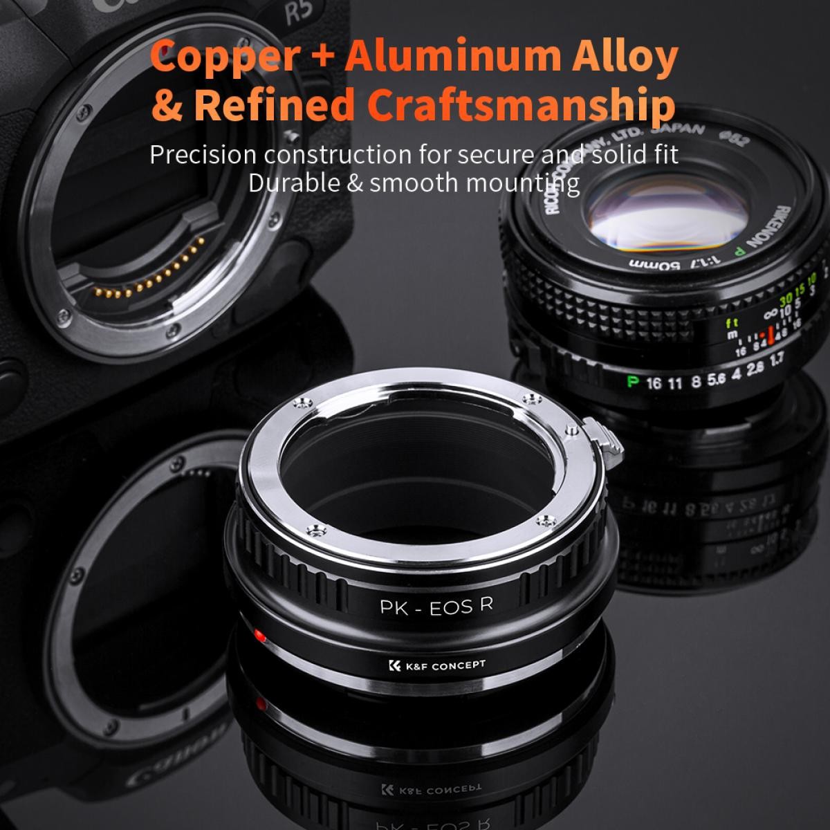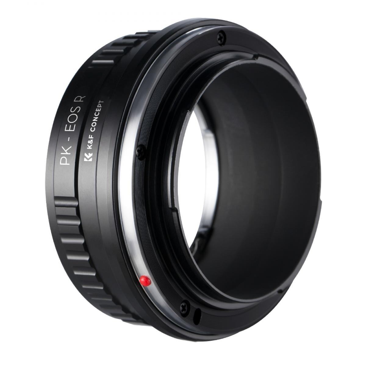The K&F Pentax K to Canon EOS R Lens Adapter enables Pentax K-mount lenses to be used on Canon EOS R-series cameras with durable metal construction, smooth manual operation, and support for infinity focus.