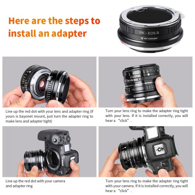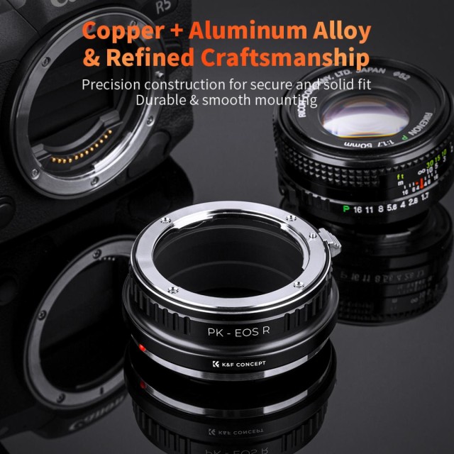 The K&F Pentax K Lenses to Canon EOS R Mount Camera Adapter is designed for photographers who want to enjoy the distinctive rendering of Pentax K-mount lenses on modern Canon EOS R-series mirrorless cameras. Precision-crafted from high-quality brass and aluminum, the adapter provides a secure and stable connection while ensuring long-term durability. This fully manual adapter allows manual focusing and manual aperture control directly from the lens and supports infinity focus for versatile and accurate shooting. Ideal for creative exploration with legacy lenses, it provides a reliable, high-precision fit for both casual shooting and professional work. For heavy or large lenses—particularly medium-format types—using a telephoto bracket or tripod is recommended to maintain stable balance during use.