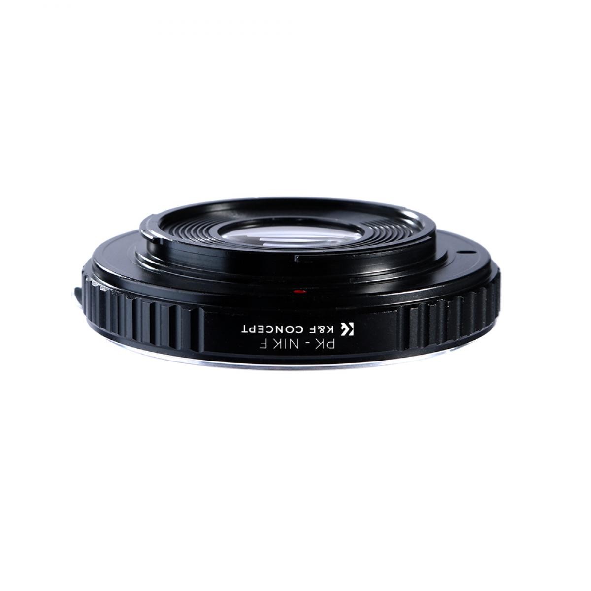 The K&F Pentax K to Nikon Lens Adapter with Optical Glass allows Pentax K-mount lenses to be used on Nikon DSLR cameras, featuring precision brass and aluminum construction, full manual operation, and integrated optical glass for infinity focus.