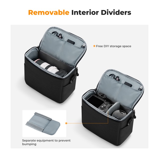 ✔MULTI-PURPOSE:This crossbody camera bag comes with 1 removable padded divider to for personalized storage. keep camera and others separated and protected, also enable you to customize main compartment for different size of camera equipment. After removing inner dividers, it can easily convert it from a dslr camera bag into a stylish everyday shoulder bag.