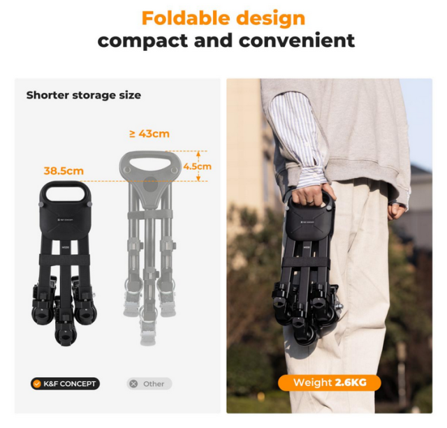 - Lightweight & Portable: Folding to a compact size of 38.5cm/15.2in and weighing just 2.6kg/5.7lbs, this tripod dolly is easy to transport. An ergonomic handle and included storage bag make it convenient for on-the-go professionals.