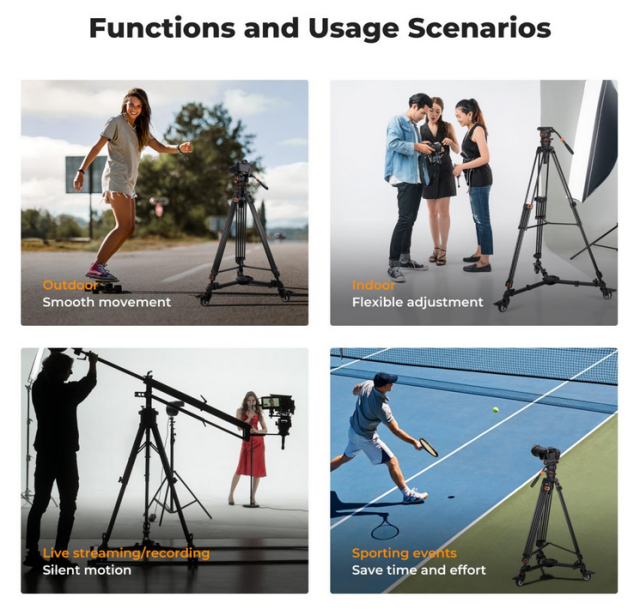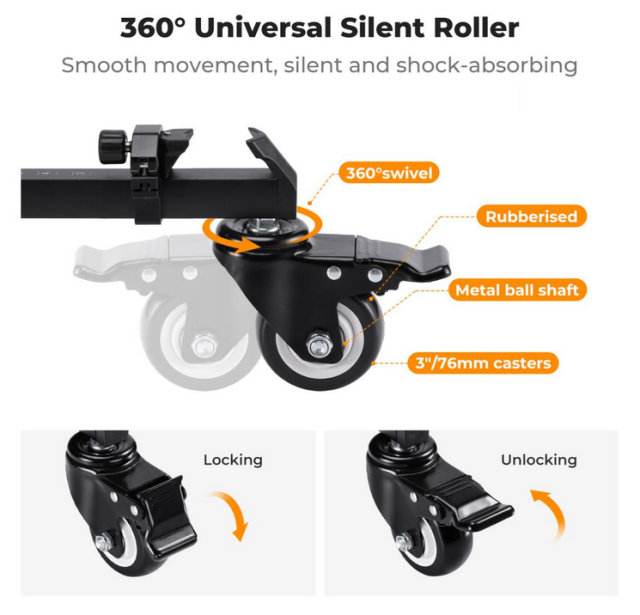 - Large, Durable Wheels: Equipped with 360° 3-inch silent wheels featuring metal ball bearings and rubber construction, the dolly offers smooth, noise-free movement, ensuring stable shooting even on uneven surfaces.
