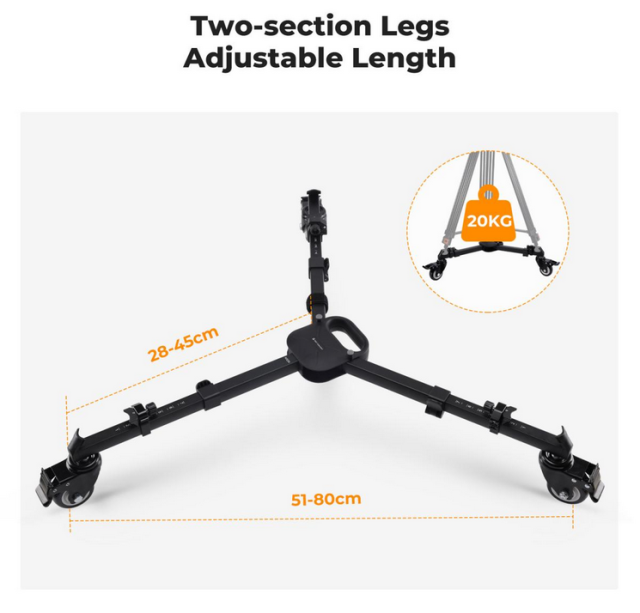 - Strong Load Capacity: Built with durable aluminum alloy, the dolly supports a load of up to 20kg/44lbs, making it reliable for heavy-duty photography and videography equipment.