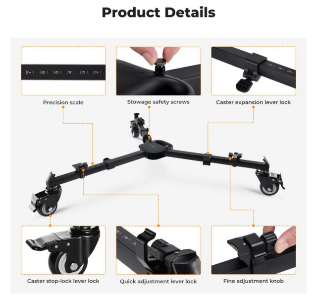 - User-Friendly Design: The camera dolly features buckle locks for quick wheel adjustments and Velcro straps to secure the legs when folded, preventing movement and damage during transport.