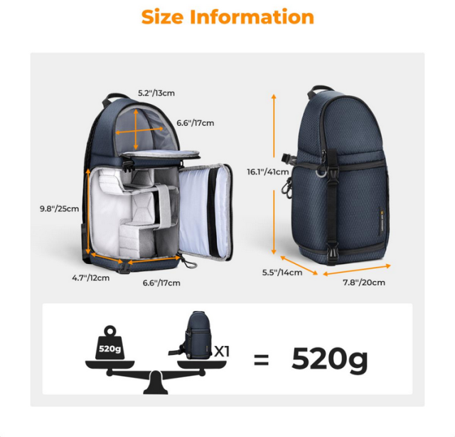 The K&F 10L Urban Wander 02 Camera Sling Bag (Blue) combines practicality and style for photographers on the go. Measuring 16 x 8 x 6 inches (L x W x H), this durable camera sling bag offers multiple compartments to securely store your camera, lenses, flash units, accessories, and personal belongings. The slim yet spacious design features a lower storage compartment with modular inserts to organize your gear and an upper compartment for essential accessories.