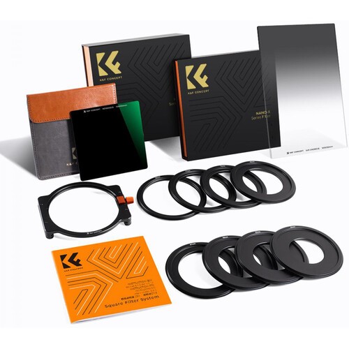 The K&F SNJ51T Square Filter Kit combines a 100×100mm 10-stop ND1000 filter and a 100×150mm 3-stop soft graduated ND filter to give photographers precise control over exposure. Made from Japanese AGC optical glass with 28-layer nano-coatings, this kit includes a metal filter holder and adapter rings for versatile lens compatibility.