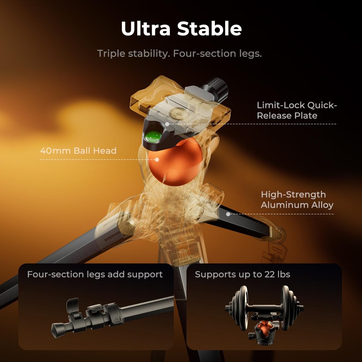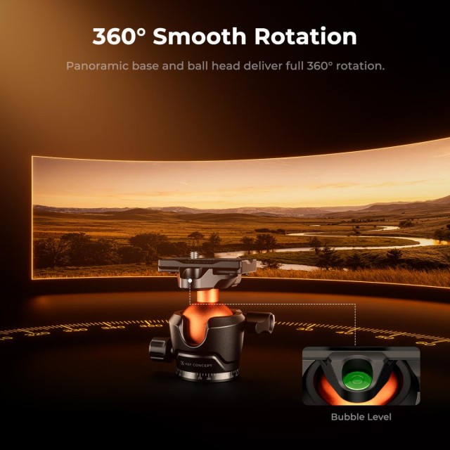 The ball head has a diameter of 40 mm and can support a load of up to 10 kg. The legs are made of high-quality aluminum alloy.