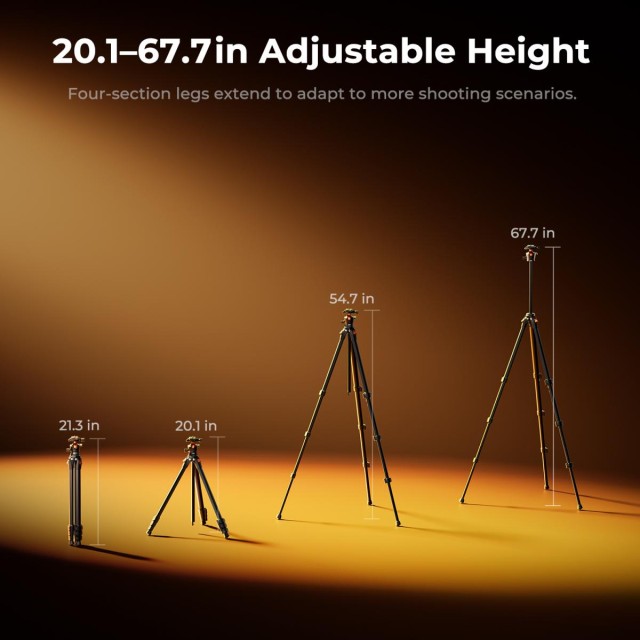 The K&F A304A3+BH-40 is a 67" (172 cm) aluminum travel camera tripod with a ball head that is compatible with the Arca system. The tripod is compact, lightweight, and portable, making it suitable for DSLRs, mirrorless cameras, binoculars, iPhones, or teleprompters.
