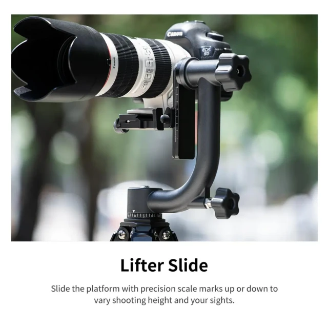 ·Precise adjustment: Large knobs with spirit levels are easy to use, and numbered scales along the swivel base and vertical arm allow you to easily repeat your settings for different lens and camera combinations.