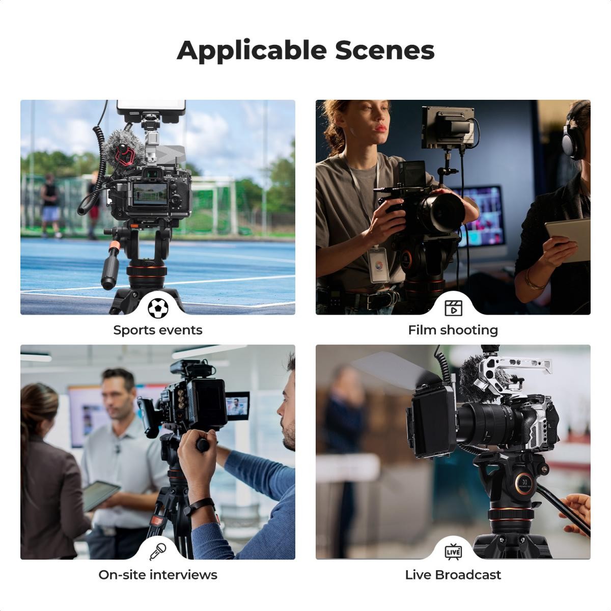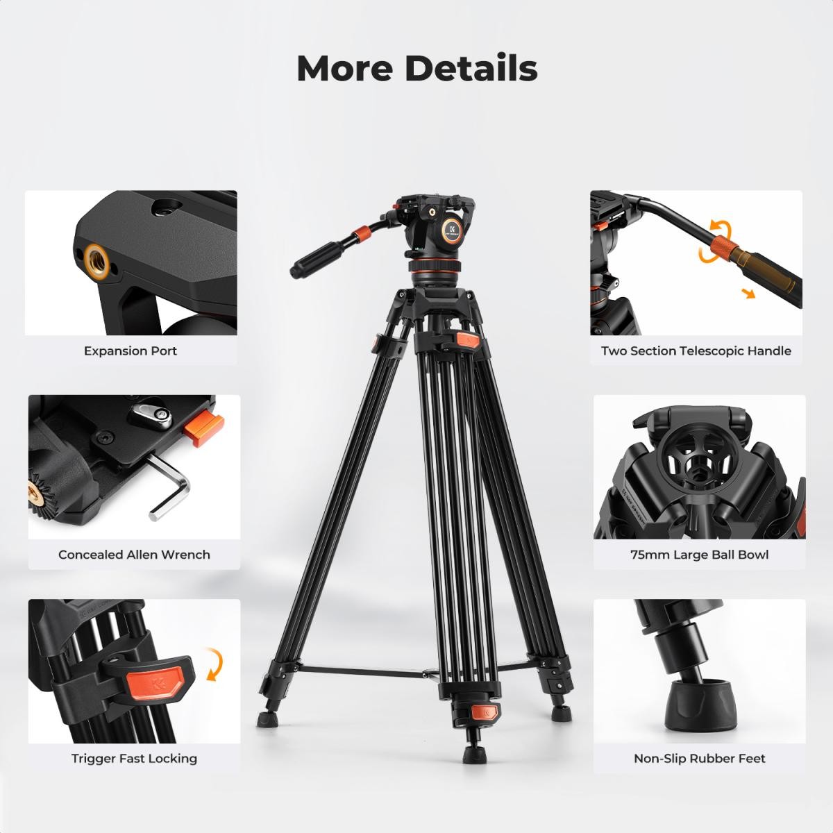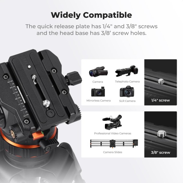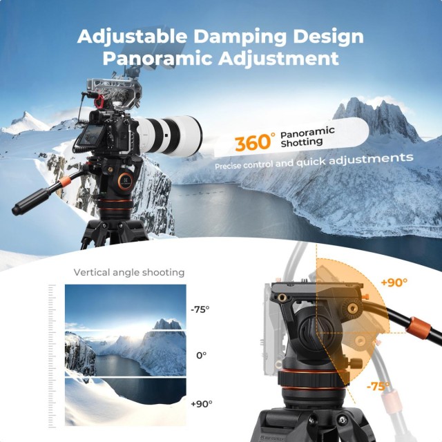 The K&F VA3+BV10 tripod system combines professional-grade fluid head performance with exceptional stability and versatility. Its hydraulic damping enables smooth horizontal and vertical camera movements, supporting vertical angles from 75° to 90°, ideal for both video production and detailed photography. The 75mm large ball head ensures wide adjustment range and robust support for heavy cameras and lenses, while the panoramic shooting feature offers infinitely adjustable damping for precise 360° horizontal rotation. The quick release plate base supports up to 8kg and is compatible with DJI RS2/RS3 and Manfrotto plates, accommodating 1/4″ and 3/8″ screws to adapt to various devices. The horseshoe-shaped anti-slip foot pad ensures stability across diverse ground conditions, and a hidden multifunctional hexagonal wrench improves operational convenience. Additionally, a 3/8″ screw hole on the base allows connection to various professional accessories such as sliders and additional tripods, making the VA3+BV10 a versatile solution for professional shooters.