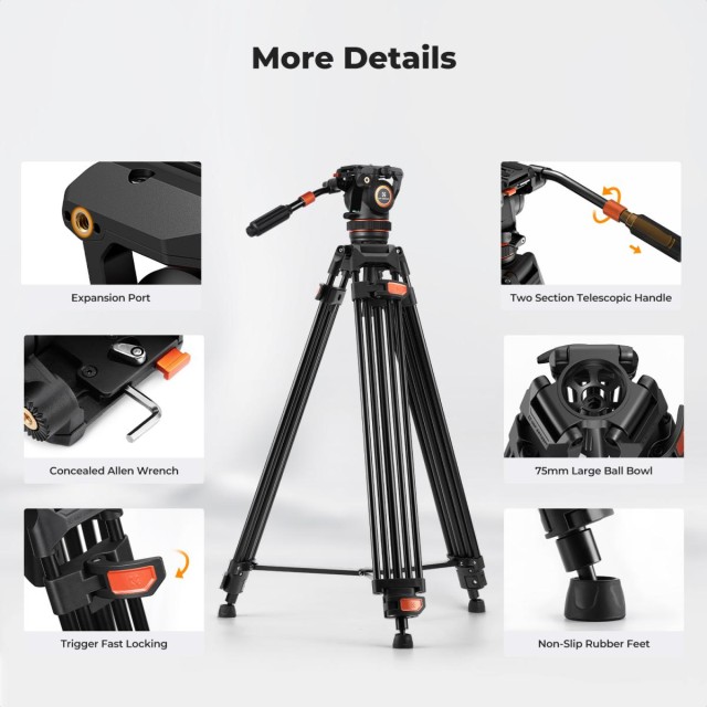 The K&F VA3+BV10 is a professional-grade fluid head tripod system designed for smooth, precise camera movements. With hydraulic damping, a 75mm large ball head, and a versatile quick release plate compatible with DJI RS2/RS3 and Manfrotto systems, it ensures stability, flexibility, and ease of use for both video shooting and fine photographic composition.