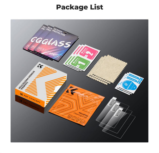 The K&F Camera Screen Protector Set includes 3 tempered glass protectors and a vacuum cleaning cloth, designed specifically for Canon G9X II, G9X, G7X III, G7X II, G7X, G5X II, and G5X cameras. These protectors offer 9H hardness, crystal clarity, and easy, bubble-free installation.