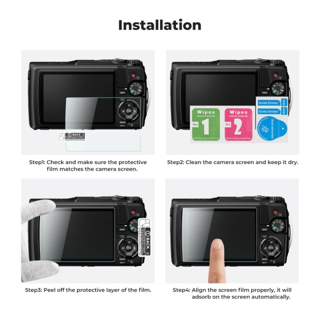 These protective films are specially designed for Olympus TG-7, TG-6, TG-5, and TG-4 cameras. The package includes 3× protective glass for the display and 3× cover for the slide for precise installation without air bubbles.