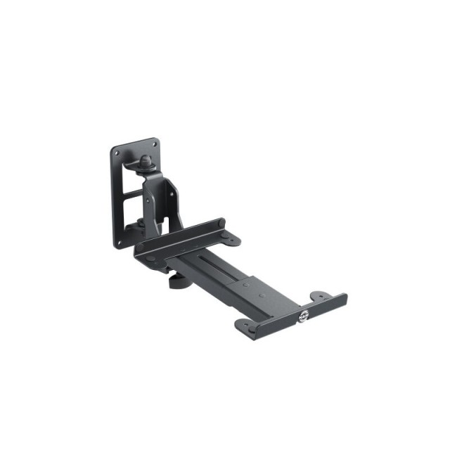 Steel wall mounted speaker bracket M with adjustable arm. Load capacity up to 15 kg. The arm can be rotated to both sides up to 54° and infinitely tilted up to -17°. Width is 170 mm and depth between 150 - 220 mm. Self-adhesive rubber pads protect the speaker surface and prevent vibration noise. Quick adjustment. Robust metal construction with durable powder coat finish. Manufactured in black.