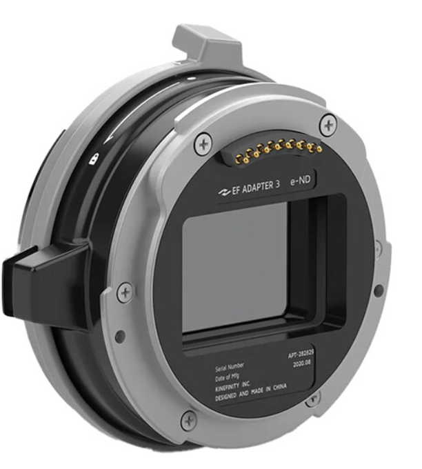 The Kinefinity EF 3 Mounting Adapter w/ e-ND (A230-003-01) is designed for all KineMOUNT cameras. Clockwise lock + active latch, hot-swap, auto color calibration, wheel control—no matte box, no IR shift. Perfect for solo ops, gimbal, documentary.