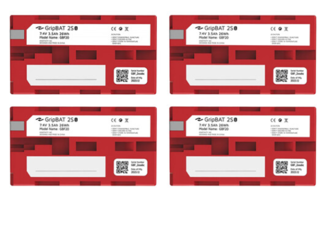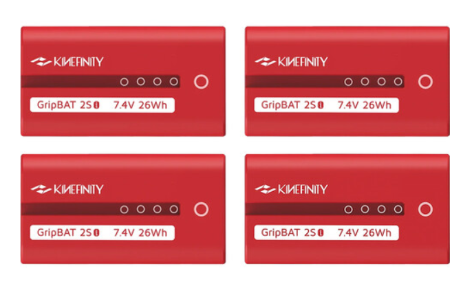 The Kinefinity GripBAT 2Si 4-Pack (A941-201-02) delivers 4× 3500 mAh / 26 Wh Sony L-Series batteries in red/white. 75 % more capacity than NP-F550, 5 A / 40 W continuous, 4-LED gauge, full protection. Perfect for MAVO Edge hybrid plate, monitors, lights—90 min full charge with PD Hybrid Dual Charger.