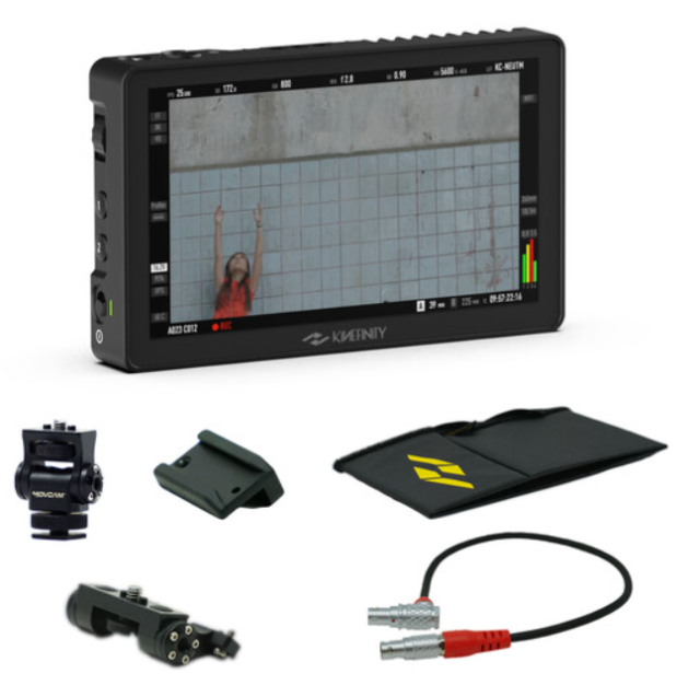 The Kinefinity A912-001-01 KineMON 5U II Complete Monitor Package is the all-in-one daylight-viewable monitoring solution for MAVO Edge 8K, MAVO LF, and TERRA 4K cameras, bundling the ultra-bright 2000-nit 5" KineMON-5U II touchscreen, 12" right-angle video/power cable, swivel mount, cold-shoe adapter, EVF wedge block, and foldable sun hood for instant on-camera or rig deployment in any lighting condition.