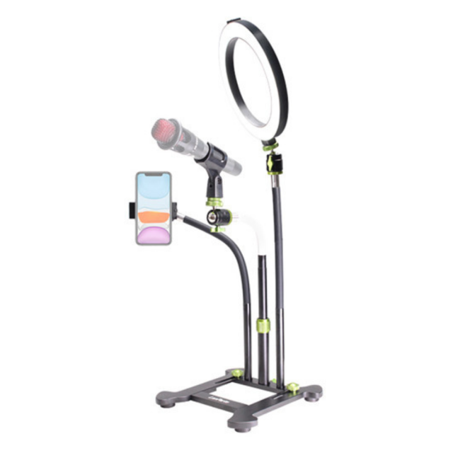 Film vlogs, livestream, and more from any flat surface with the Livestream Desktop Smartphone Stand from LanParte. The tabletop stand features three adjustable gooseneck arms that end in a microphone holder, smartphone clamp, and attachment for an LED ring light, all with fully adjustable ball-jointed necks. With all of the optional accessories added, this stand can provide you with what you need to elevate your content for a more polished and professional look.