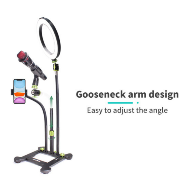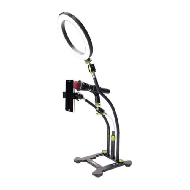Film vlogs, livestream, and more from any flat surface with the Livestream Desktop Smartphone Stand from LanParte. The tabletop stand features three adjustable gooseneck arms that end in a microphone holder, smartphone clamp, and attachment for an LED ring light, all with fully adjustable ball-jointed necks. With all of the optional accessories added, this…
