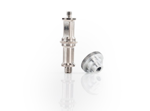 Constructed from durable metal alloy, the spigot features a standard 5/8" (16 mm) mounting diameter along with both 1/4"-20 and 3/8"-16 threaded connections, ensuring compatibility with a wide range of lighting equipment and stands. A knurled locking knob is included to provide a firm and secure attachment, preventing unwanted movement during use. Compact and reliable, this adapter is ideal for studio and location photographers who require a dependable connection between their flash heads and softbox modifiers.