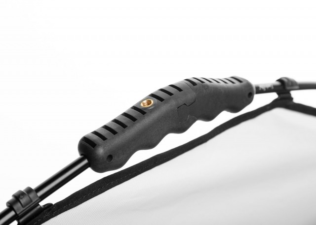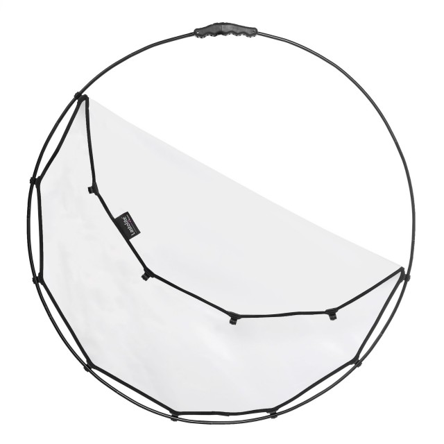 The lightweight folding aluminium frame slides in quickly and easily and the two-foot diffuser fabric simply attaches to the frame. The cleverly designed RapidExoframe™ design folds into several smaller pieces and packs into a case measuring only 6.5 x 27 x 6.5 cm (2.5" x 10.5") and weighing only 335 g (reflector and case).