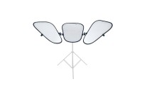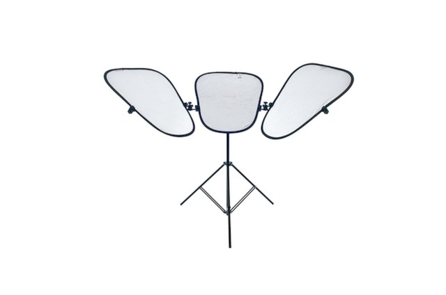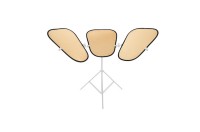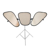 Each reflector panel features a dual-sided Sunfire (gold/silver blend) and silver surface, offering flexibility between warm, soft tones and brighter, more contrast-rich reflections. The adjustable hinge system enables independent positioning of each panel, making it easy to fine-tune lighting angles for different subjects and setups. Designed for portability, the entire system folds down compactly and fits into a carry bag, making it suitable for both studio and on-location use. Lightweight yet sturdy, the Triflector MKII is an essential tool for achieving professional-quality portrait lighting.