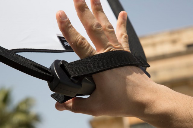 Large TriGrip reflector for shots that require full-body illumination with reflected light, for example. Replacing the circular shape of standard diffusers, the TriGrip uses a triangular design that provides a much stronger and more stable structure. One of the advantages is also a contoured handle with a locking strap.