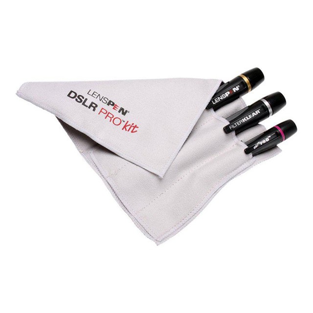 The LensPen DSLR Pro Kit is a comprehensive cleaning solution designed for maintaining the cleanliness of lenses, viewfinders, and filters. It includes a standard-size LensPen, a FilterKlear for filters, a MicroPro for small optics, and a microfiber cloth for portability.