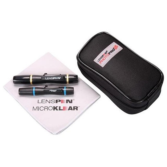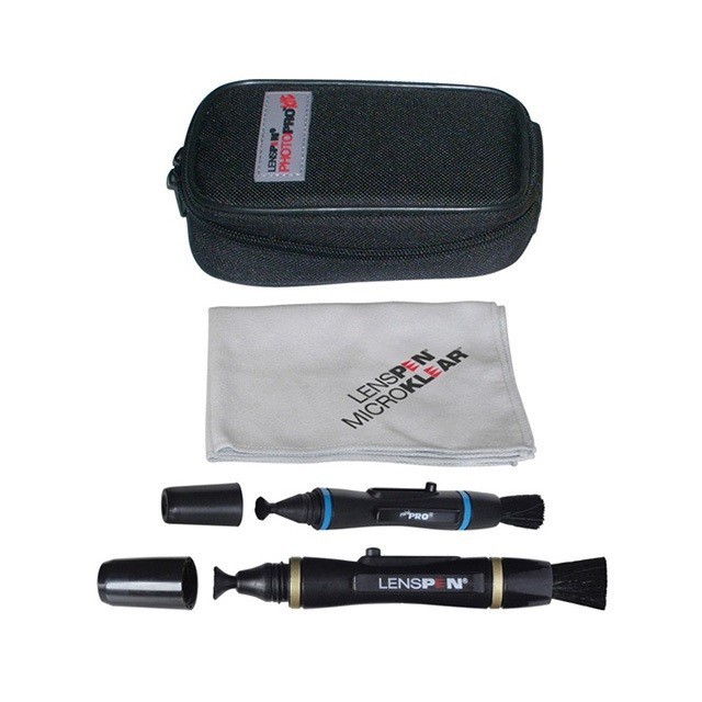 The LENSPEN PhotoPro Kit is a portable lens cleaning set designed to keep cameras, lenses, and optical devices free of dust, fingerprints, and smudges. It includes a LensPen, MiniPro pen, microfiber cloth, and a nylon carrying bag with belt loop for on-the-go cleaning.